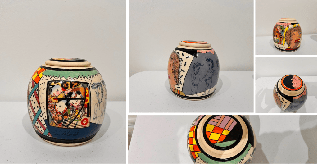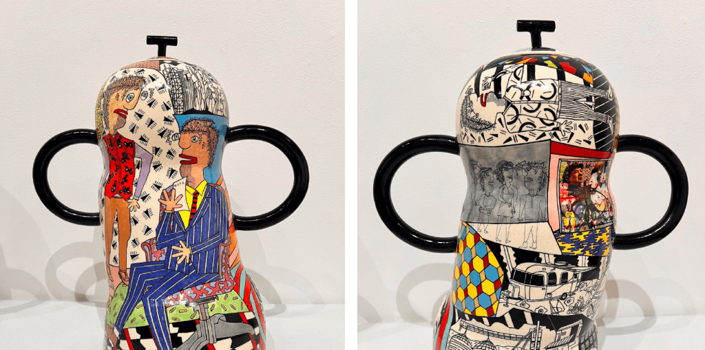 Kitschy and confused are another way of describing the collaged, bright, and minutely detailed compositions. Kohoutek’s postmodern aesthetic laid bare on ceramic tiles and amorphic vessels reminds us of design and color familiar to the Memphis Group, which has an appeal that is a pastiche of thrift store aesthetics including clashing patterns with colors, and wackiness, combined with figuration and autobiographical storytelling. The presentation of Kohoutek’s work at the museum brings the community an important opportunity to engage in a visual conversation with a significant local ceramic artist whose work is curious and engaging.