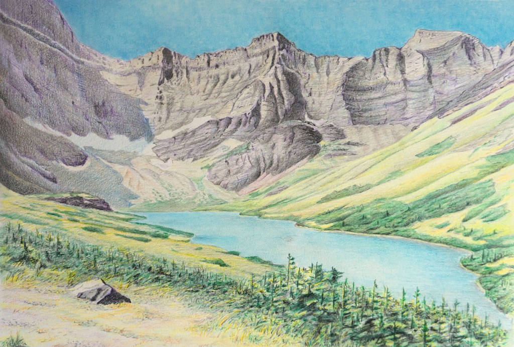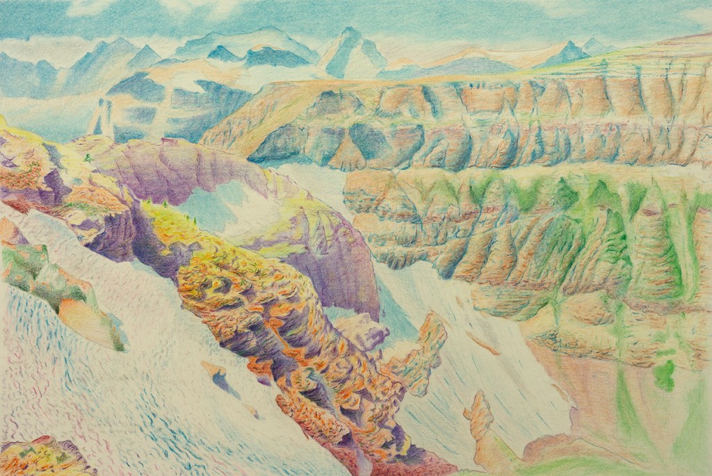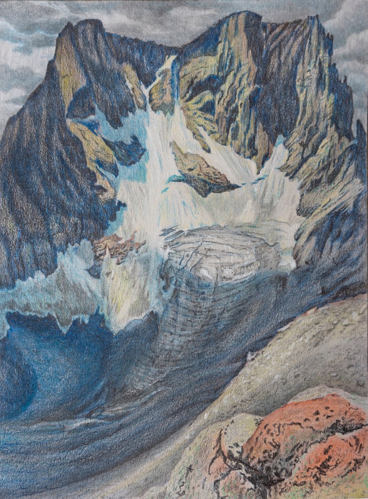 The 57 colored-pencil drawings that comprise the exhibition, titled Something to Hold, is Marquis’ unique visual record of Montana’s glaciers. Marquis is rendering epic landscapes and immense expanses of geography in relatively small compositions (the drawings range in scale from 5×7 inches up to 18×24 inches) so even the larger works feel intensely intimate. Consider the passion for these places that drives Marquis to reach them and one can see in the work, the deep affection he holds for vast, wild places. Since the drawings span an 11-year period, it is interesting to note the evolution of Marquis’ style but also the different ways he may have felt encountering different glaciers. No other such record exists, this on-site, hand drawn record of every named glacier in Montana is honestly unique.