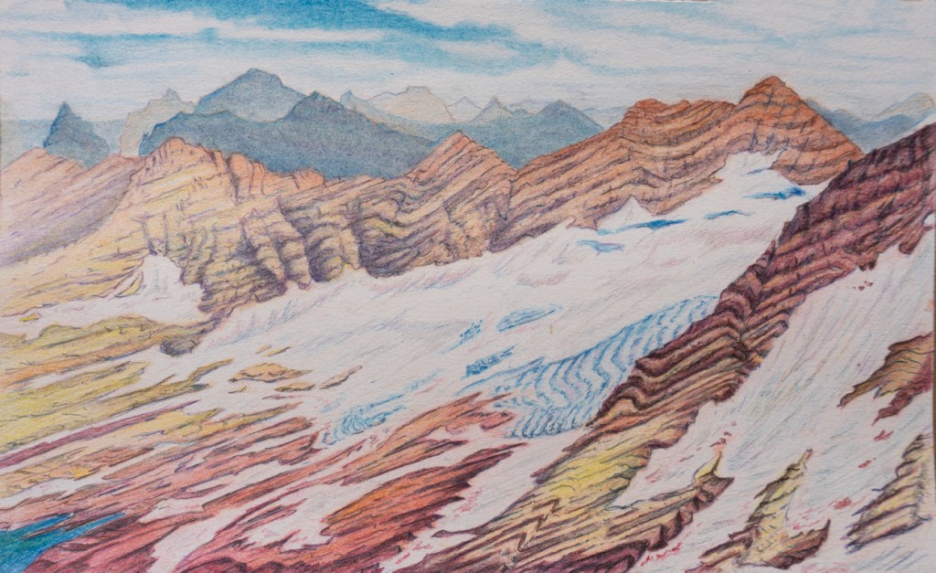 The Glacier Drawing Project began in the summer of 2014. That season, Marquis reached eight glaciers and sat down alongside the ice, on mountain summits, and exposed ridges to draw them. There are 59 named glacial features in Montana, according to USGS Survey Maps, but many have receded enough that they are no longer considered active glaciers. In the early 2010’s, there was a prevalence of news stories concerning the significant melting of glaciers in Glacier National Park due to climate change. Marquis knew that many more glaciers dotted the remote, high-country of Montana outside of the park, and set out to bear witness to the ice, thus began The Glacier Drawing Project.