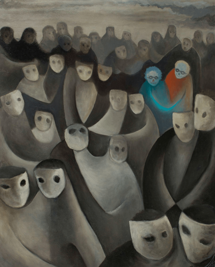This exhibit spans 64 years of Marvin Messing’s artistic creations, so it is retrospective. He was always quick to explain that his experiences in World War II profoundly influenced his work. Also, he repeated, “What I cannot say with words, I can say with my paintbrush.” His work is not easy to categorize. In a satirical and playful way Messing’s art raises social, political, and religious questions.