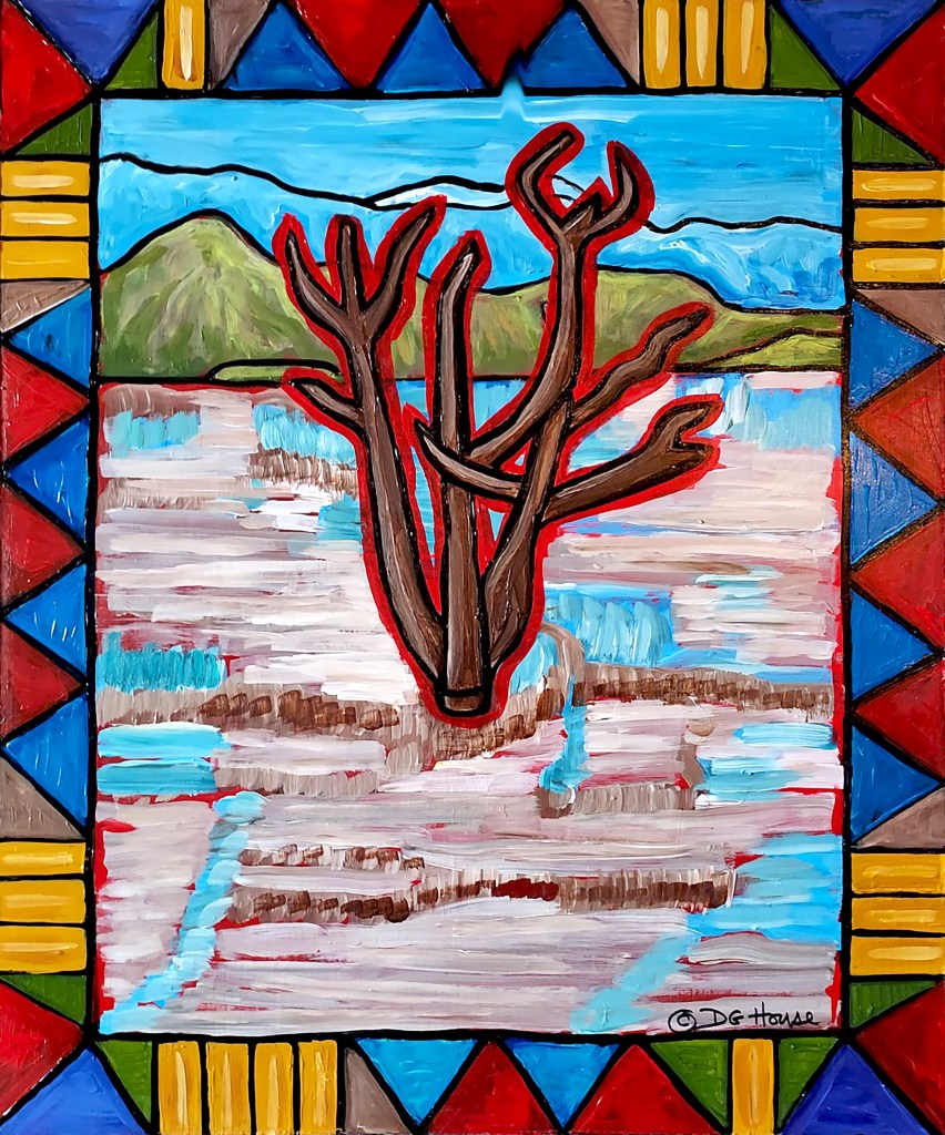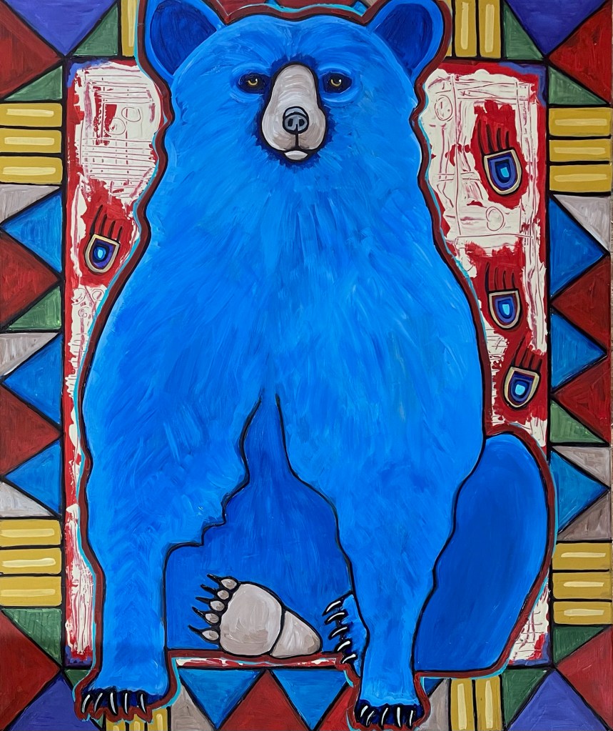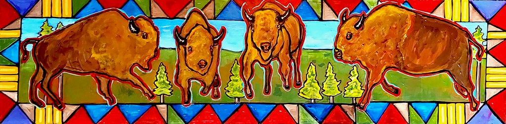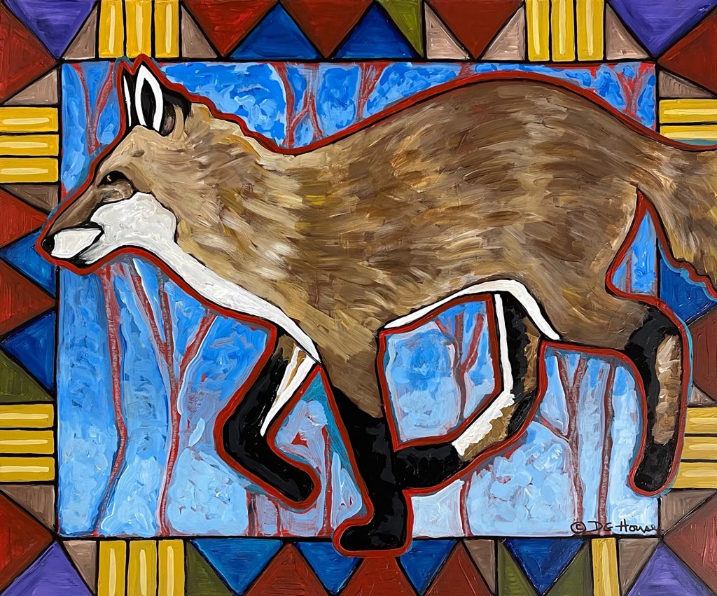 The perimeter of House’s paintings are often lined with her trademark geometric borders. Though this element is partially for composition and color placement, the main function of the border is to honor Indigenous ancestors. The patterns are reminiscent of the designs used on Native American par flèche; traditional rawhide pouches used for storage and transporting items. In addition, House’s color palette is based on the Earthen paints created by the First Peoples of the Northern Rocky Mountains from local soils, flora, and other resources.