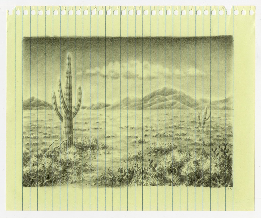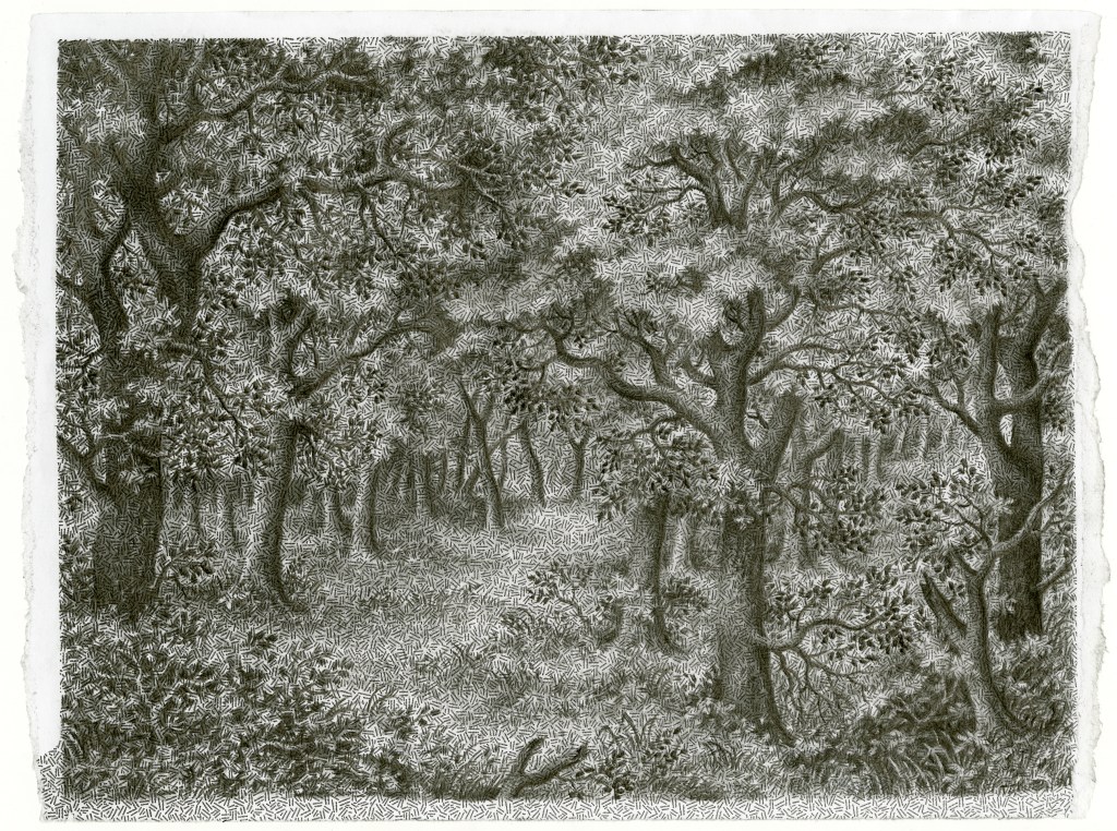 Tyler Joseph Krasowski is a virtuosic and accomplished draughtsman. While he is equally adept at printmaking, his preferred tools are pencil and paper. The exhibition reflects the artist’s excitement and delight with the immediacy of drawing, featuring a variety of approaches and subjects. Drawing is often used as a preparatory tool, but for Krasowski drawings and sketches are valued artworks unto themselves. Krasowski states, “the energy of the original cannot be replicated therefore I believe these to be the most honest ways of my expression.” Throughout his work, Krasowski references idyllic and pastoral landscape traditions. He admires the old masters, especially printmakers such as Dürer, whose images are dense, detailed, and elicit a pleasure through the act of looking. Krasowski likes to subvert expectations and often includes small hidden details that upend the viewer’s initial reading of the scene.