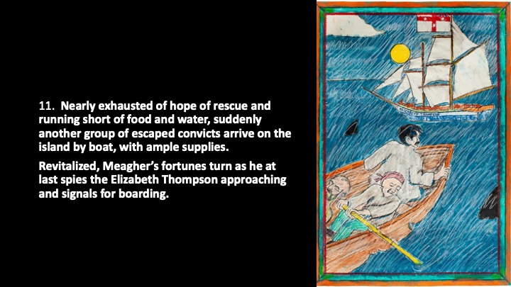 Glueckert’s 24 colorful vignettes are filled with the celestial, earthly, and man-made symbols that governed Meagher’s life: