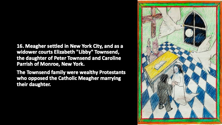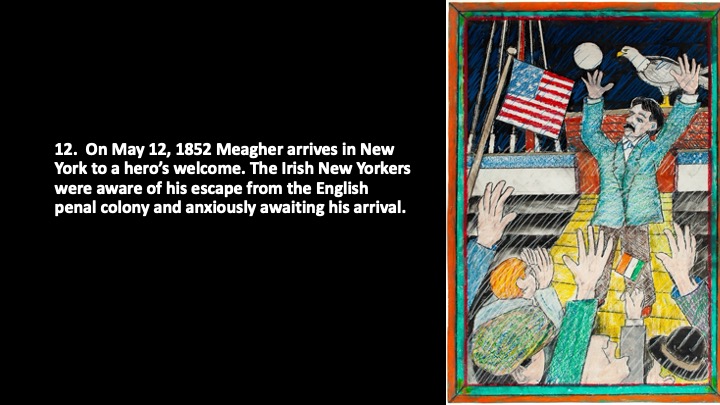 Art engages the heart as well as the mind and is one of the most effective ways to engross an audience, pique their interest, and increase their awareness of history. As you spend time with Stephen Glueckert’s expressive oil pastel drawings you will feel the danger, energy, and emotion of Meagher’s odyssey.