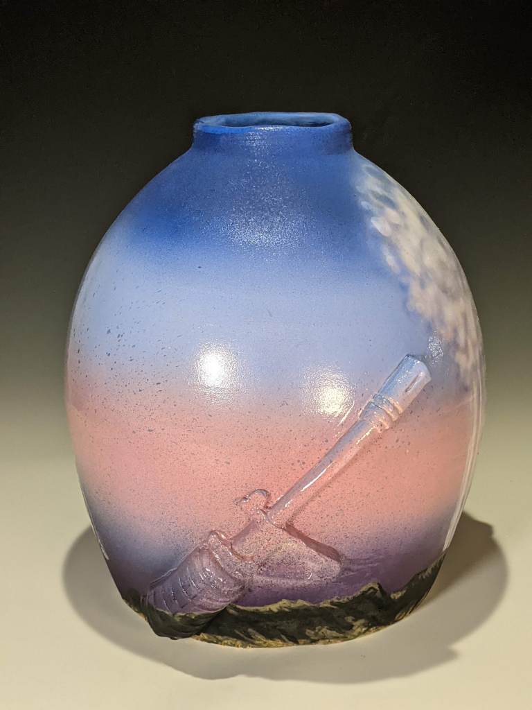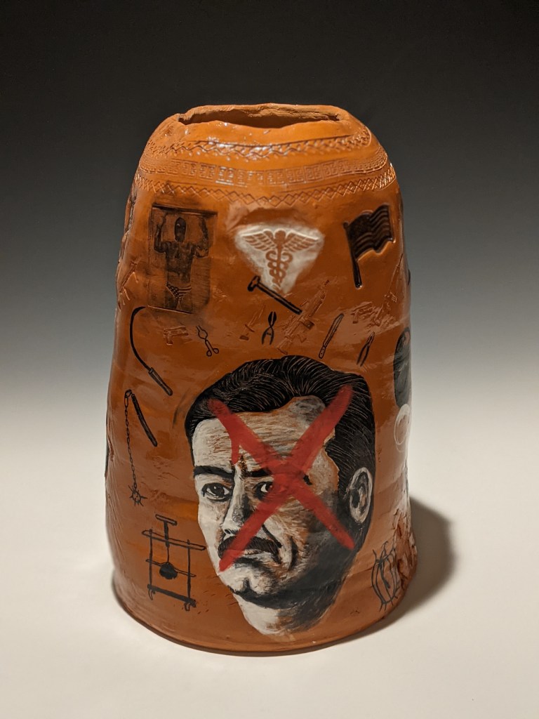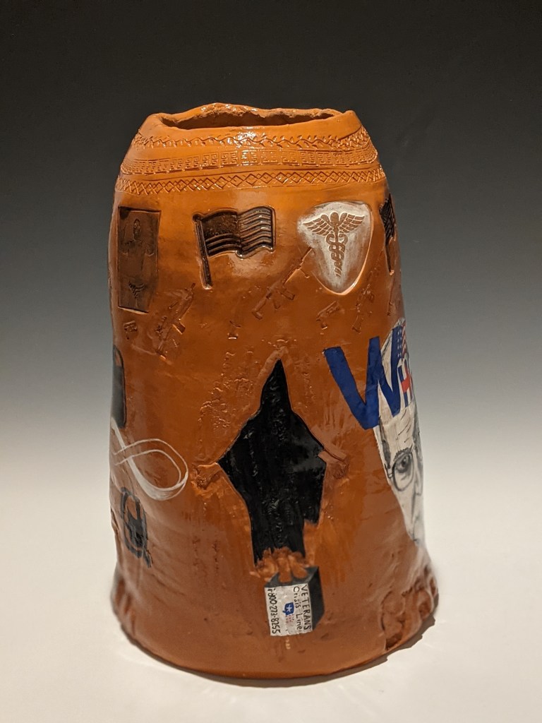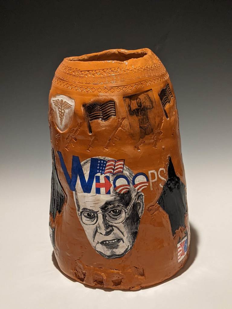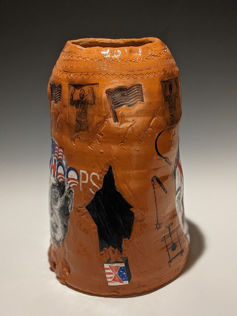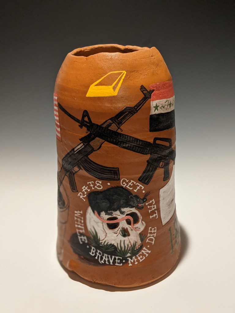Wheel-thrown pottery painted with underglaze and stamped with artifacts worn and carried in Iraq. These pieces take on an unflinching and humorous look at his autobiographical journey to war (and his families), and the long hard way home.