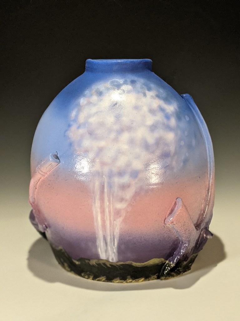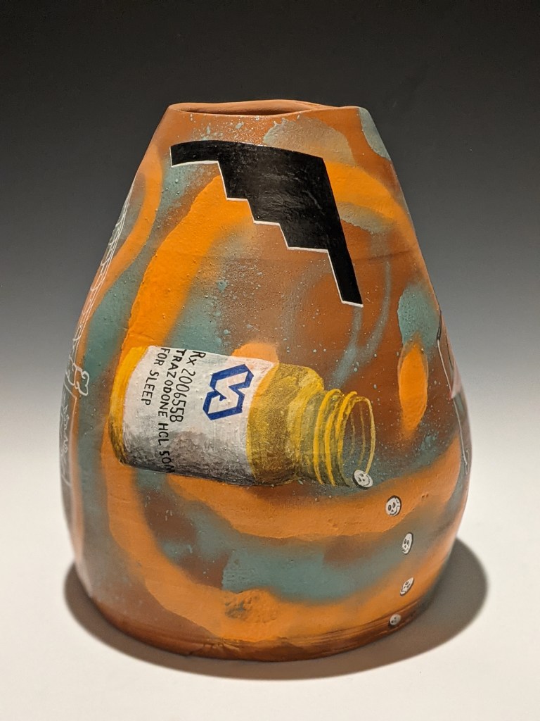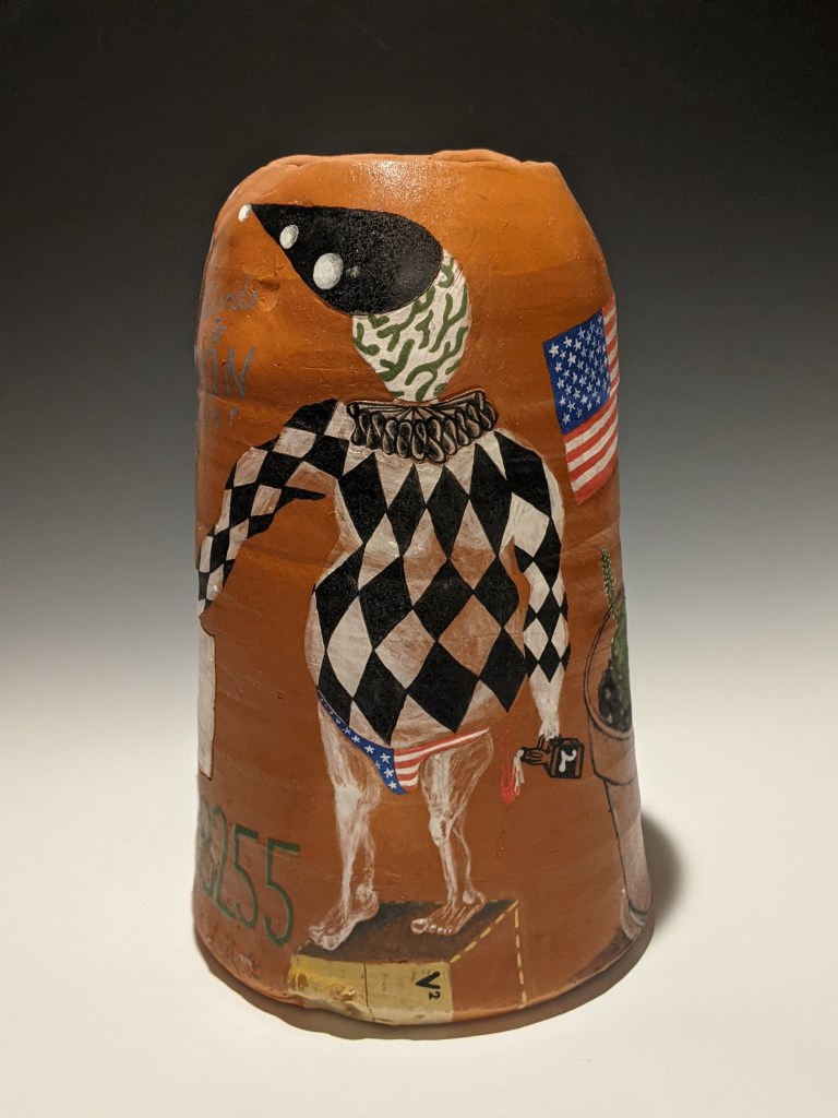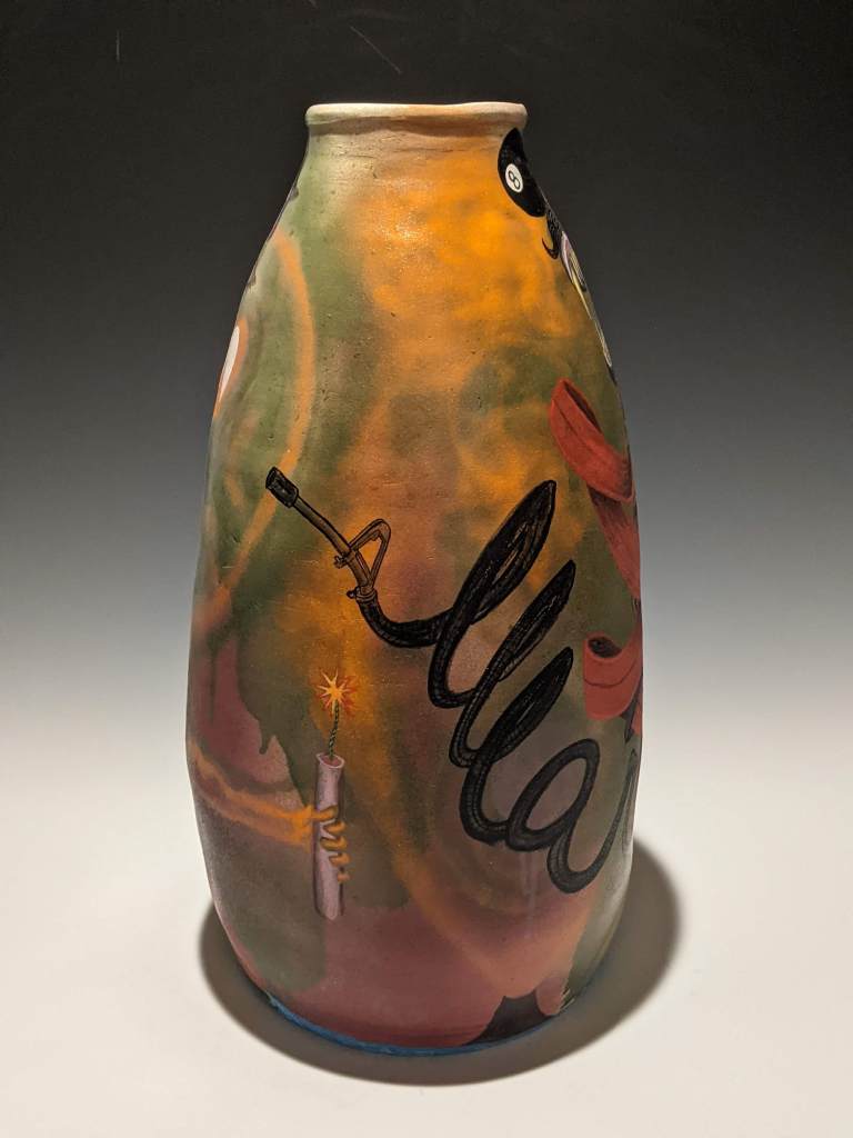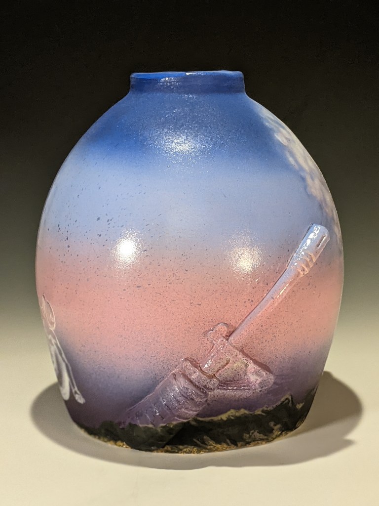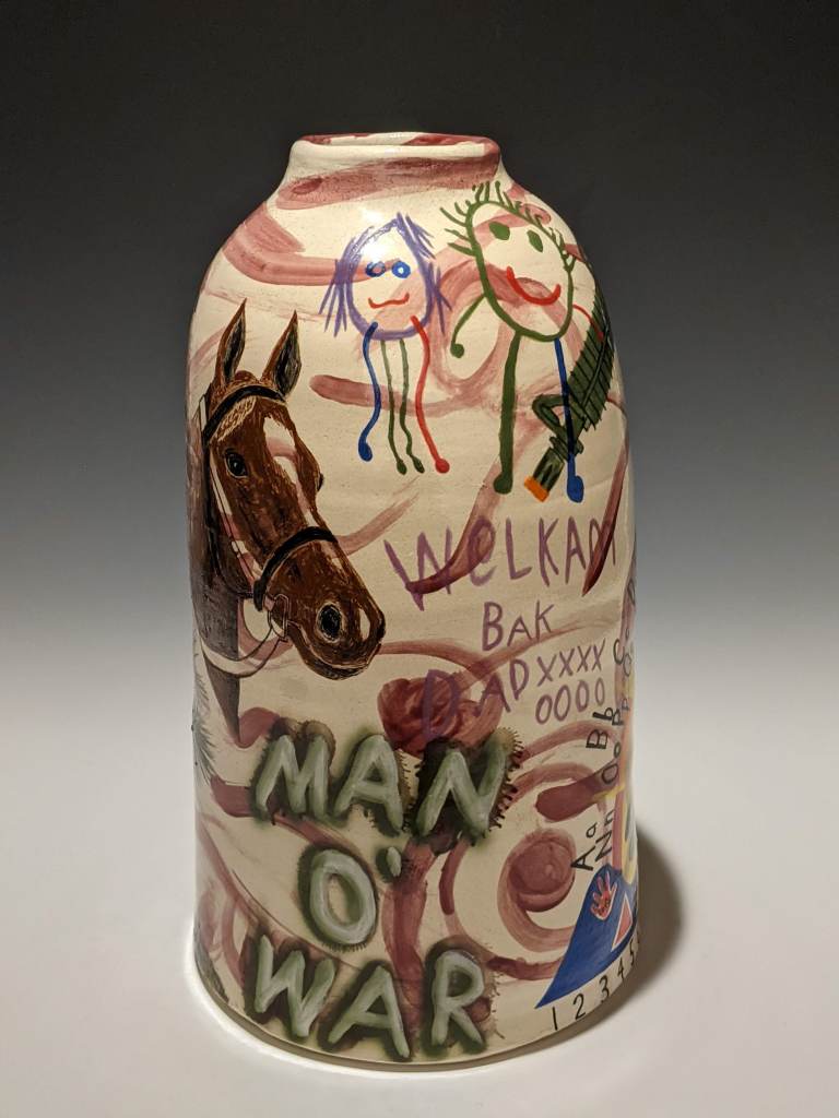 Wheel-thrown pottery painted with underglaze and stamped with artifacts worn and carried in Iraq. These pieces take on an unflinching and humorous look at his autobiographical journey to war (and his families), and the long hard way home.