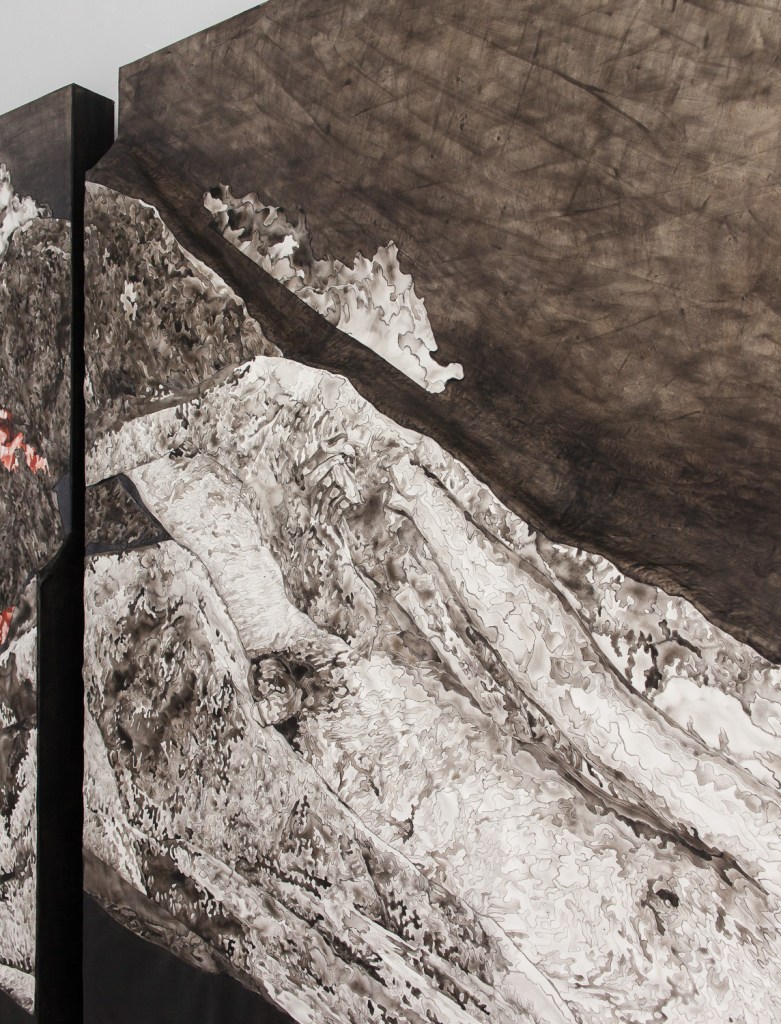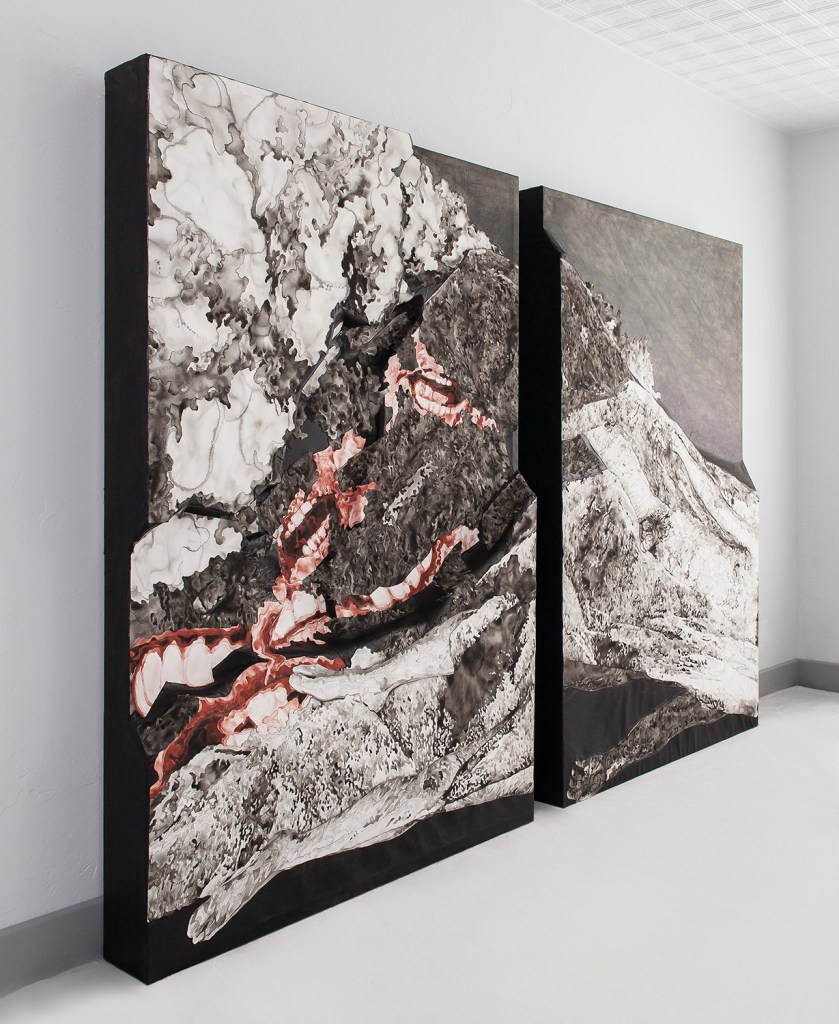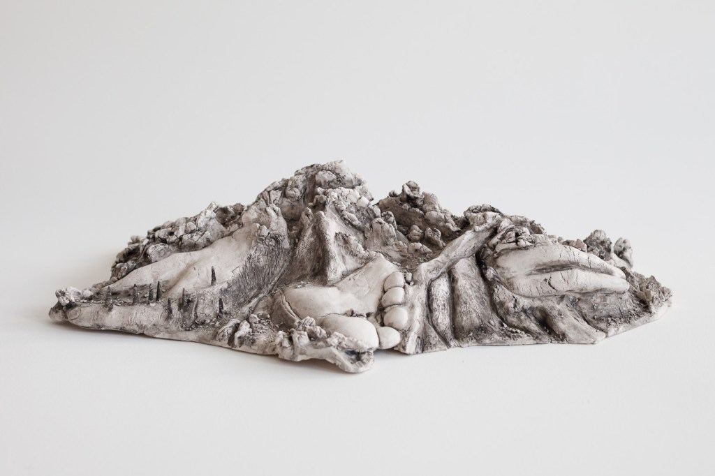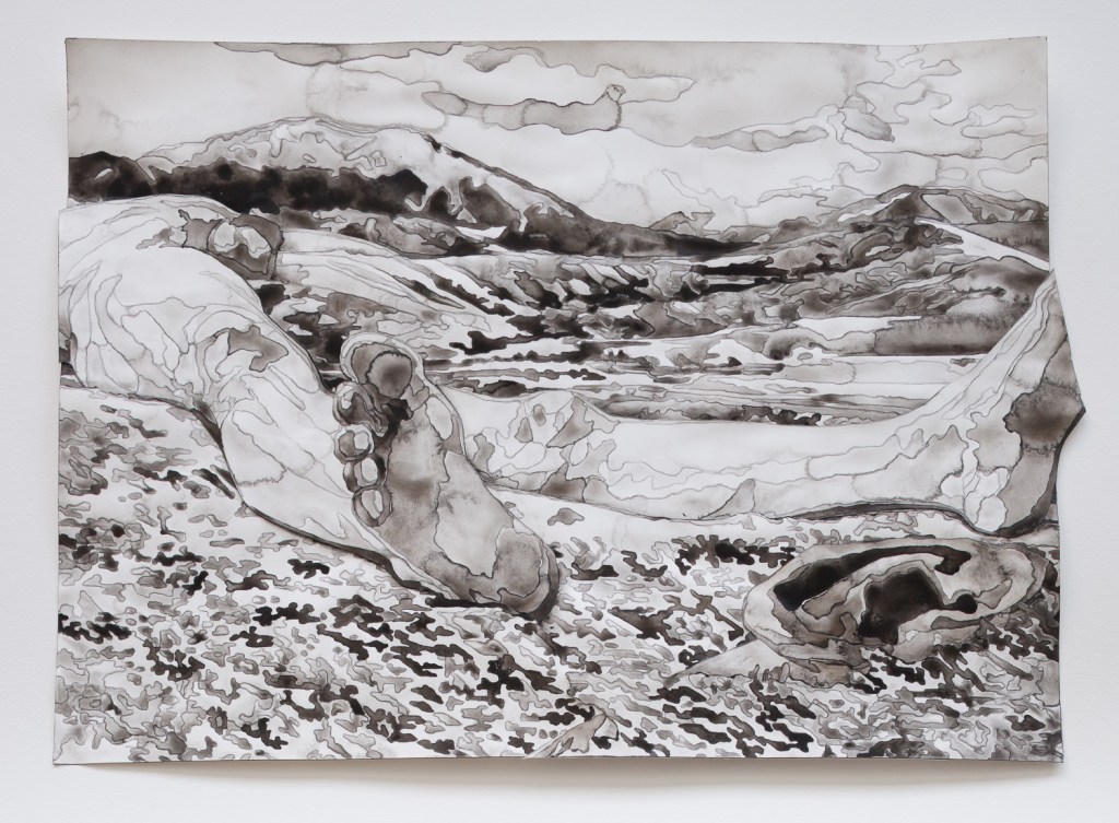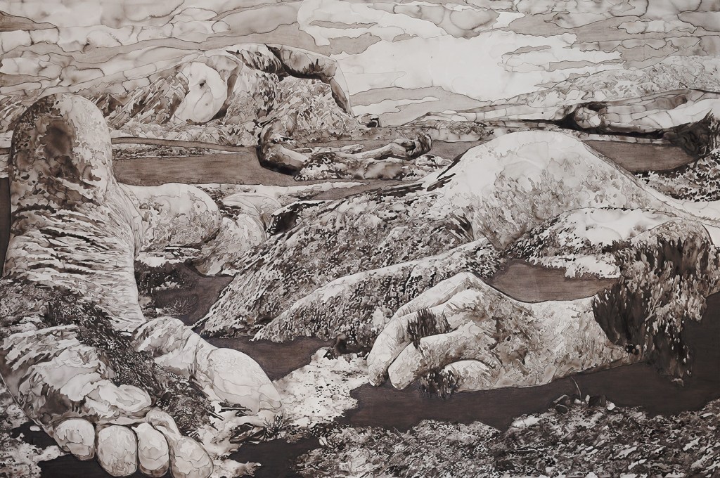Unsettled Lands is a body of work that engages with traditional themes in visual culture from the mythic American West; of both landscape as subject, and landscape in relationship with legendary Western themes of masculinity, heroism, mastery, and stewardship over the land. The works are a series of watercolor, paper, and acrylic collages on canvas, works on paper, and ceramic sculptures, primarily rendered in raw sepia. This pigment (though now synthesized, was originally derived from melanin in cuttlefish ink) references both the organic nature of the body and the early photography of the 19th century and the Old West. The monochromaticity of the work also eliminates the distinction between the matter of the body and that of the landscape. While the images may engage with a specific geographic location, they imagine an allegorical historical narrative for each terrain and exist outside of an historic chronology. In an effort to unearth the legacy that is left from the act of settlement and the impulse behind the act of possession, the work references a motif found in various creation mythologies of the immolation and dismemberment of a primordial figure to build a new cosmos, essentially reimagining a creation mythology for the American West. My monolithic male figures are nude, exposed, eroded, and vulnerable, in contrast with the iconic, hypermasculine figure of legend found in the heroic frontiersman, rancher, cowboy, or outlaw. Though the inflation of the figurative scale imitates the grandiosity of the determination of will to dominate, tame, and take possession of the land, the work offers a contradictory narrative and hints at a different motivation: a desire to meld, absorb, enmesh with the land.