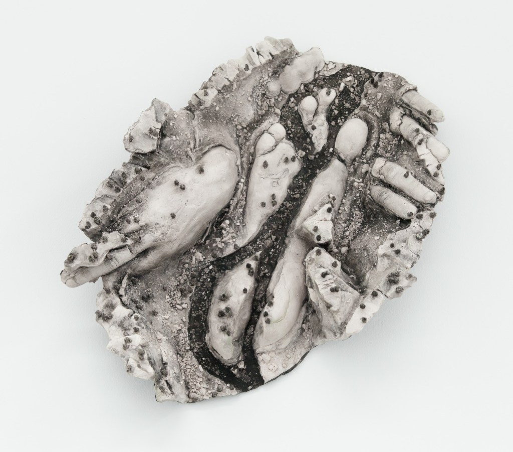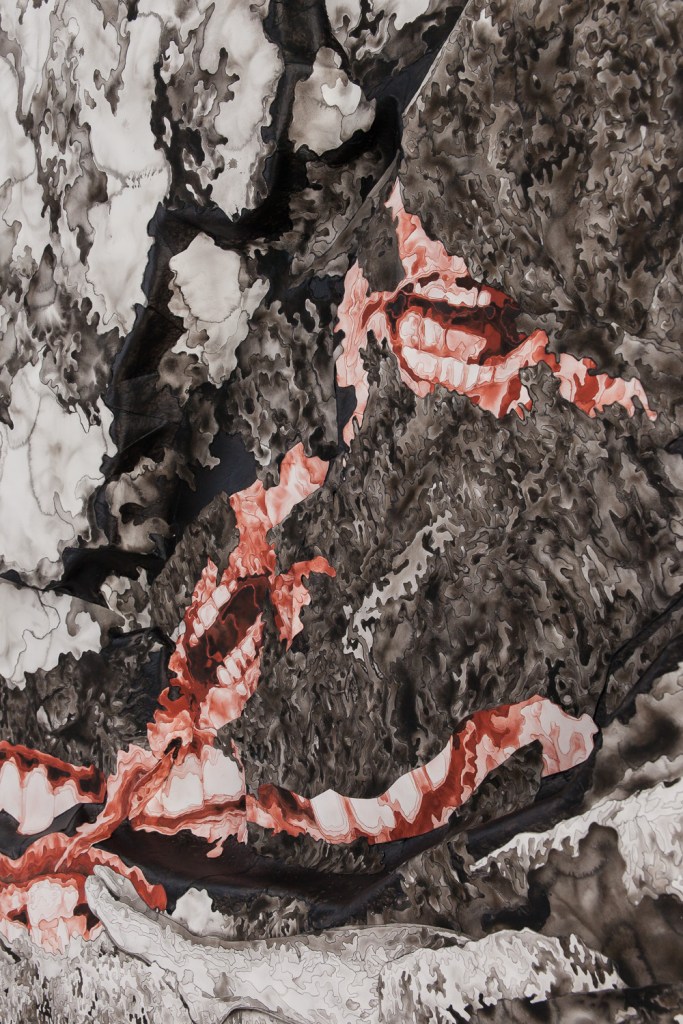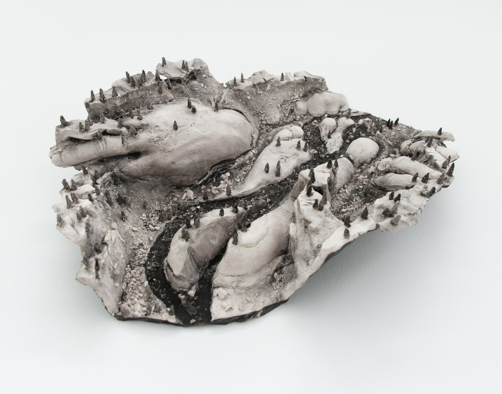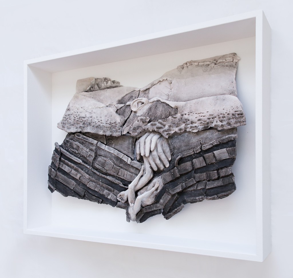 Unsettled Lands is a body of work that engages with traditional themes in visual culture from the mythic American West; of both landscape as subject, and landscape in relationship with legendary Western themes of masculinity, heroism, mastery, and stewardship over the land. The works are a series of watercolor, paper, and acrylic collages on canvas, works on paper, and ceramic sculptures, primarily rendered in raw sepia. This pigment (though now synthesized, was originally derived from melanin in cuttlefish ink) references both the organic nature of the body and the early photography of the 19th century and the Old West. The monochromaticity of the work also eliminates the distinction between the matter of the body and that of the landscape. While the images may engage with a specific geographic location, they imagine an allegorical historical narrative for each terrain and exist outside of an historic chronology. In an effort to unearth the legacy that is left from the act of settlement and the impulse behind the act of possession, the work references a motif found in various creation mythologies of the immolation and dismemberment of a primordial figure to build a new cosmos, essentially reimagining a creation mythology for the American West. My monolithic male figures are nude, exposed, eroded, and vulnerable, in contrast with the iconic, hypermasculine figure of legend found in the heroic frontiersman, rancher, cowboy, or outlaw. Though the inflation of the figurative scale imitates the grandiosity of the determination of will to dominate, tame, and take possession of the land, the work offers a contradictory narrative and hints at a different motivation: a desire to meld, absorb, enmesh with the land.
